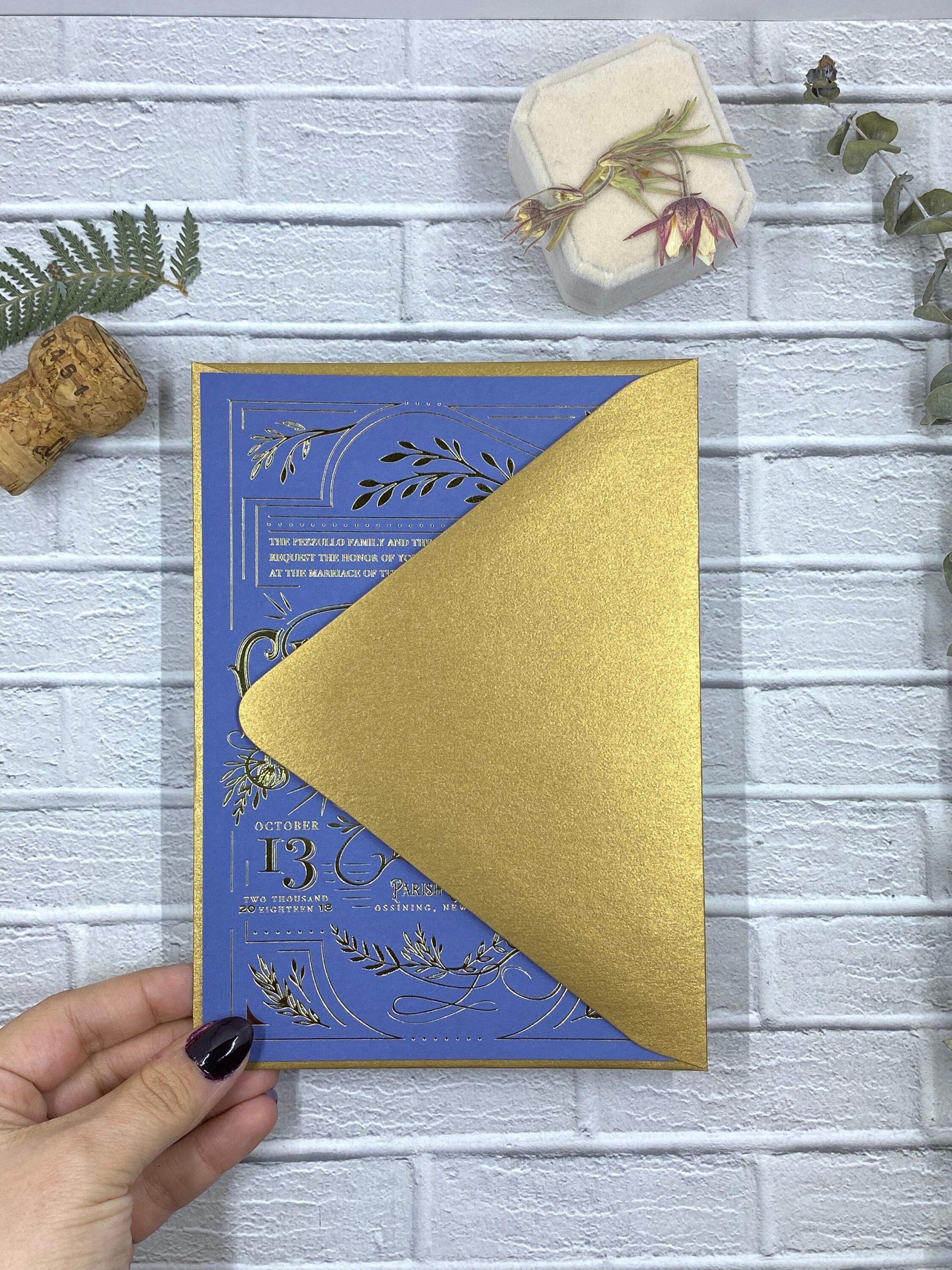Wondering what foil looks like in real life? This sample pack includes ONE wedding invitation card to give you a first-touch feel of metallic printing as an upgrade to wedding invitation work. Please note, this is a preprinted sample and customization is not available. Ships in a matching envelope*