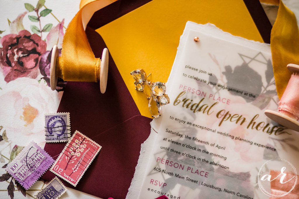 A rich burgundy envelope with a bright gold liner tied together the warmth and brightness of the April event and tied back to the colors of the watercolor flowers on the invitation’s background.