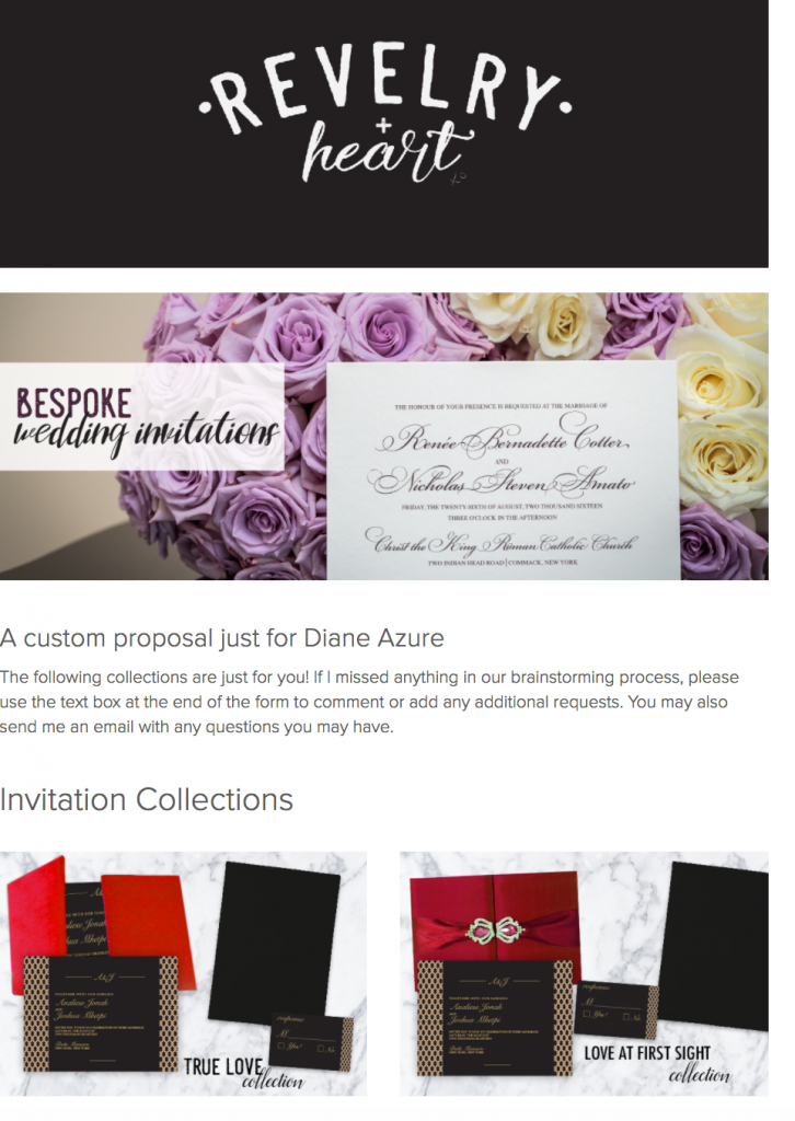 I’ve built revelry + heart on personal relationship with my clients. I strive to make the process stress-free, comfortable, and fun. All of my invitation suites come fully-assembled and shipped via FedEx or UPS with insurance and signature confirmation. I have had clients start their design over a year from their wedding as well as with only 6 weeks until their RSVP date. If you have any lingering questions about what to expect, I am just an email away! I love to talk pretty paper and would be happy to connect with you.
