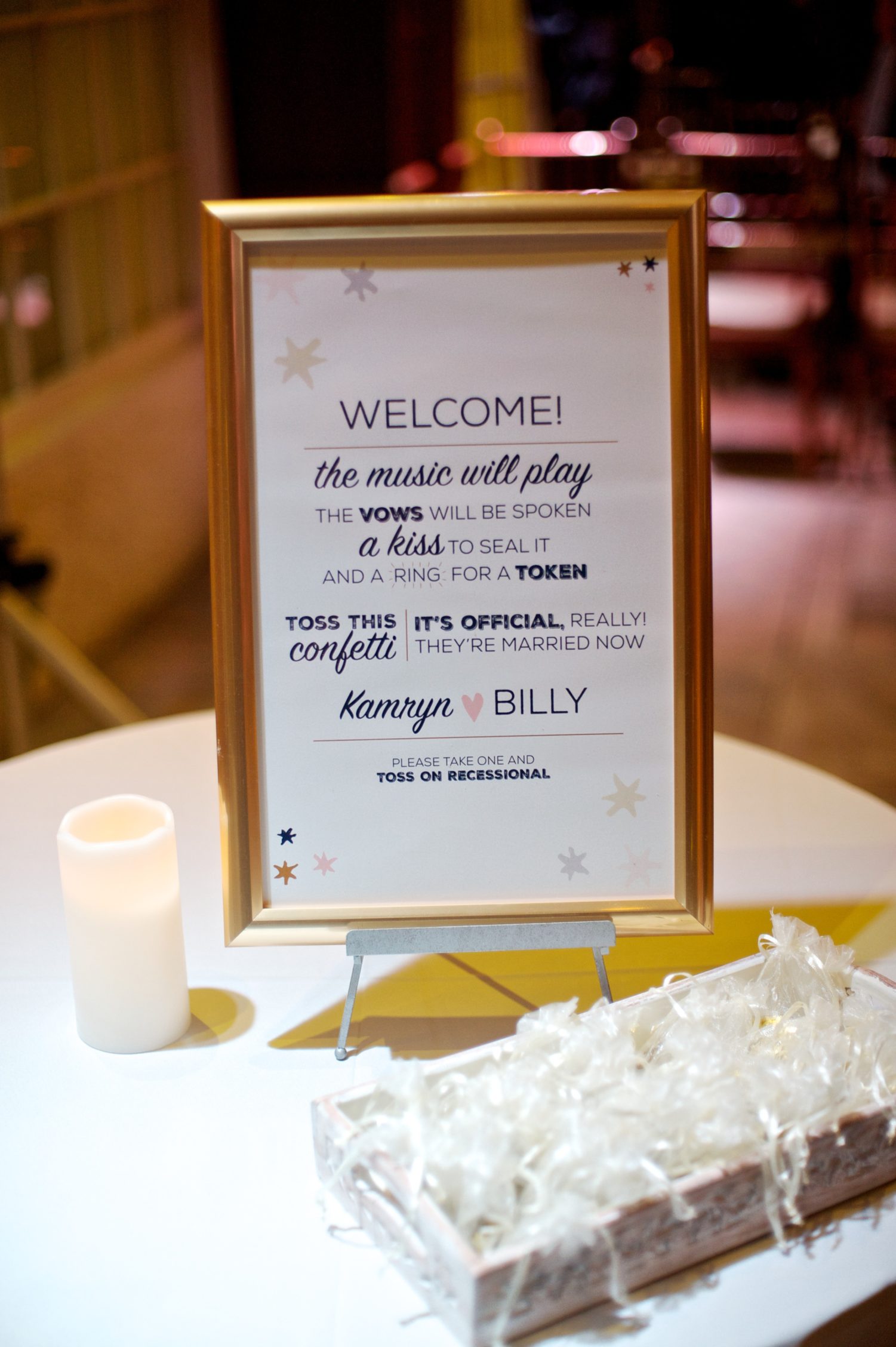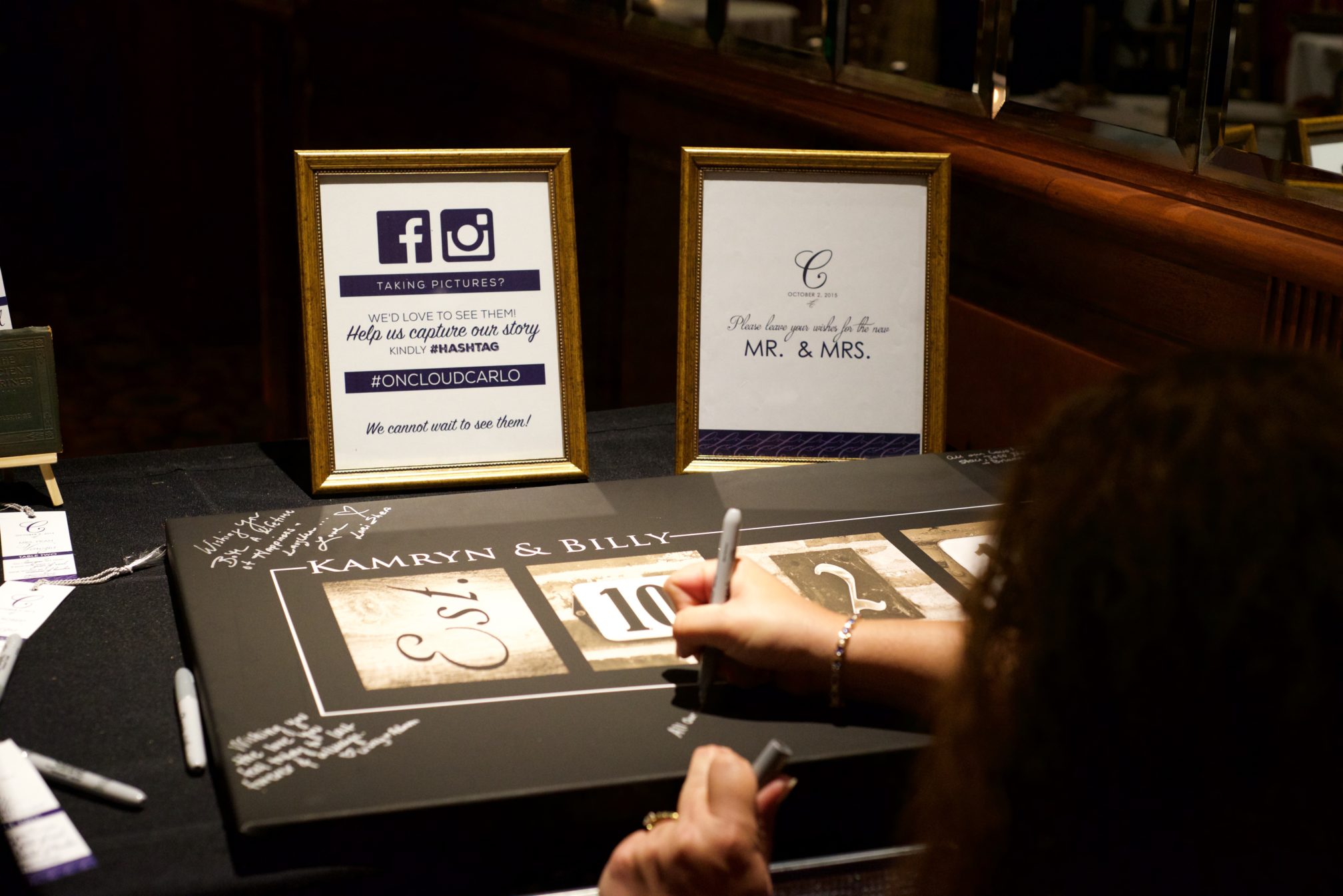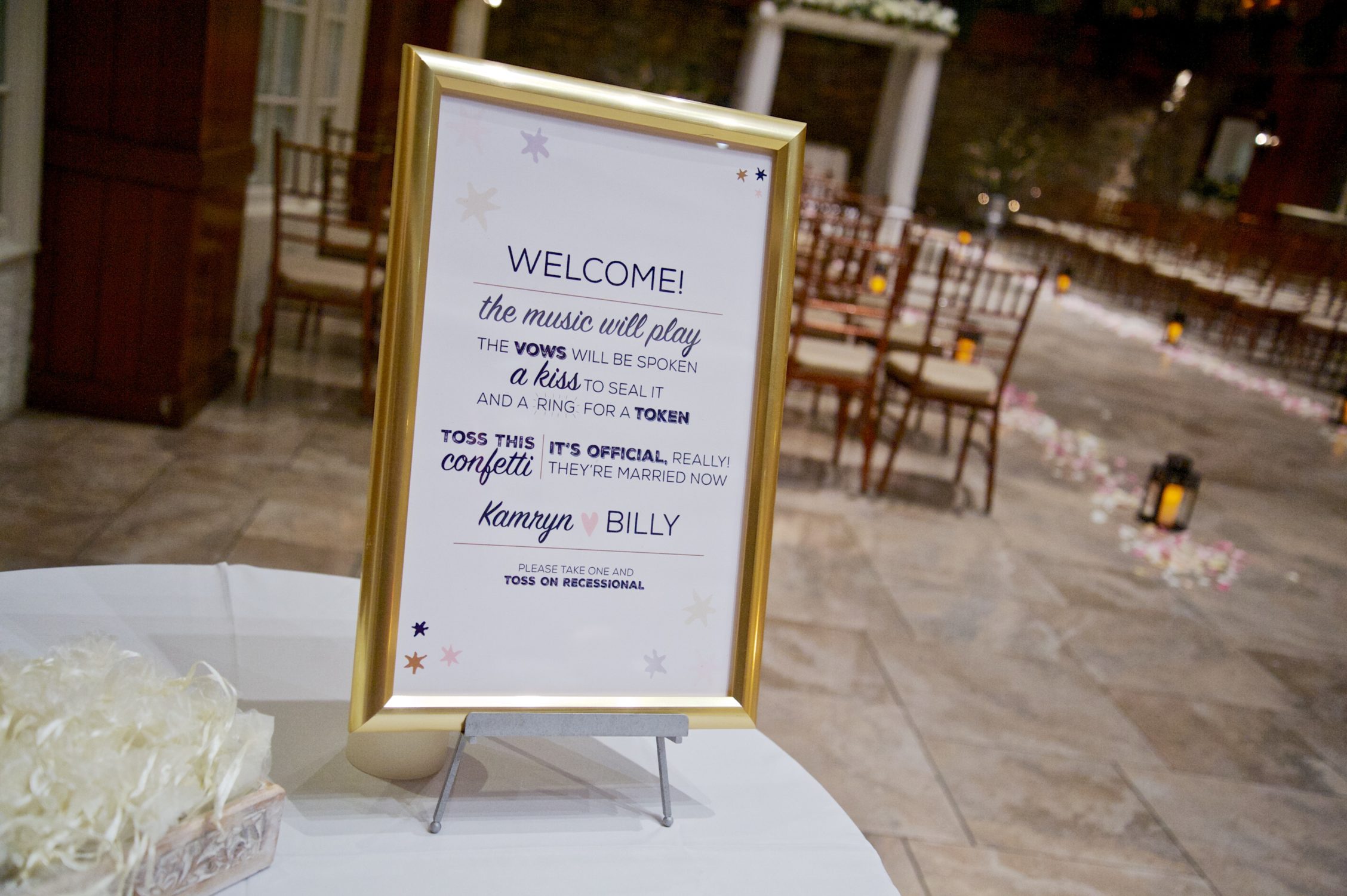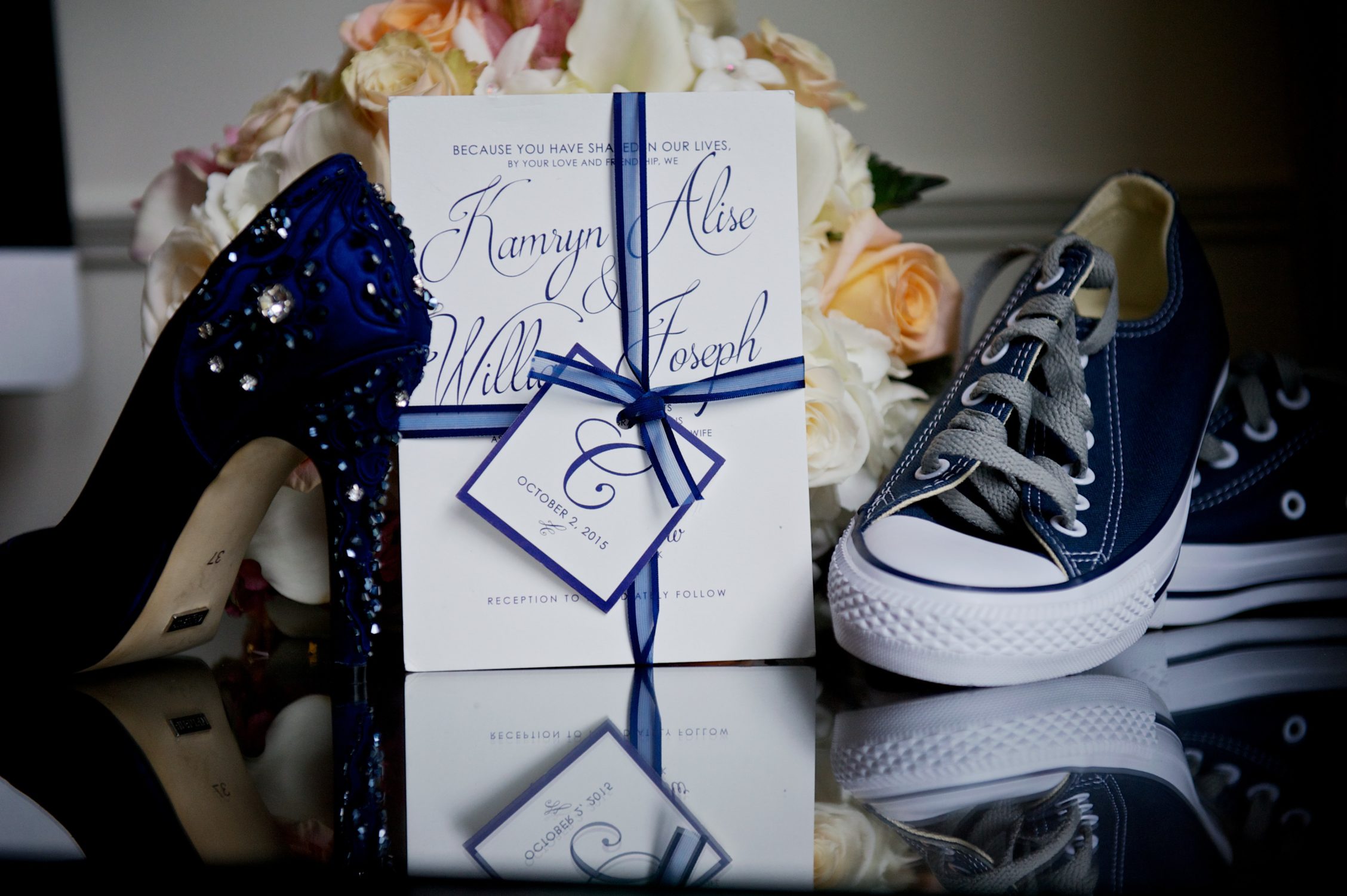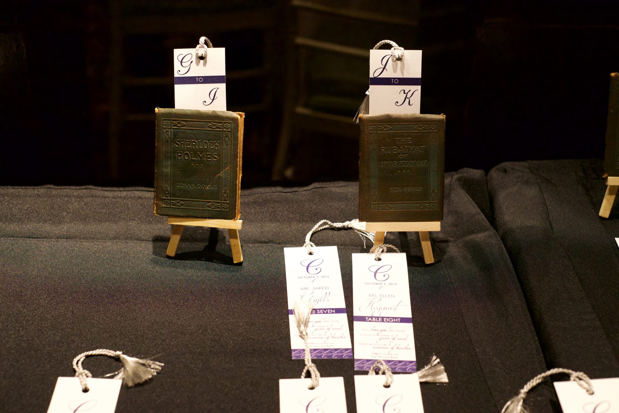 Kamryn came to me wanting a very clean design, but with some sort of wow factor. We met so that I could get a grasp on what she liked, and she fell in love with the double thick stock that was part of my collection. She loved it so much, she actually went triple thick, because, go big or go home right? She hadn’t seen that in any samples sent to her by other invitation companies, and she knew she wanted to incorporate that to really give a tangible experience to her guests upon opening. Kamryn is obsessed with navy, so we knew we’d use that as her primary color. I like how it brought a softer and more modern feel to her classic design. Together Kamryn and I created a suite with custom touches (like finding the perfect K for Kamryn) and adding the famed Harry Potter star illustrations to her day-of stationery. We created bookmark escort cards for her bibliophile side with mini vintage books to display each section of the alphabet. Between picking the right paper for the job and helping her pick which color of organza bag to hold her confetti for the exit toss (the things you stress over as a bride!), I truly enjoyed working with Kamryn to personalize her wedding.