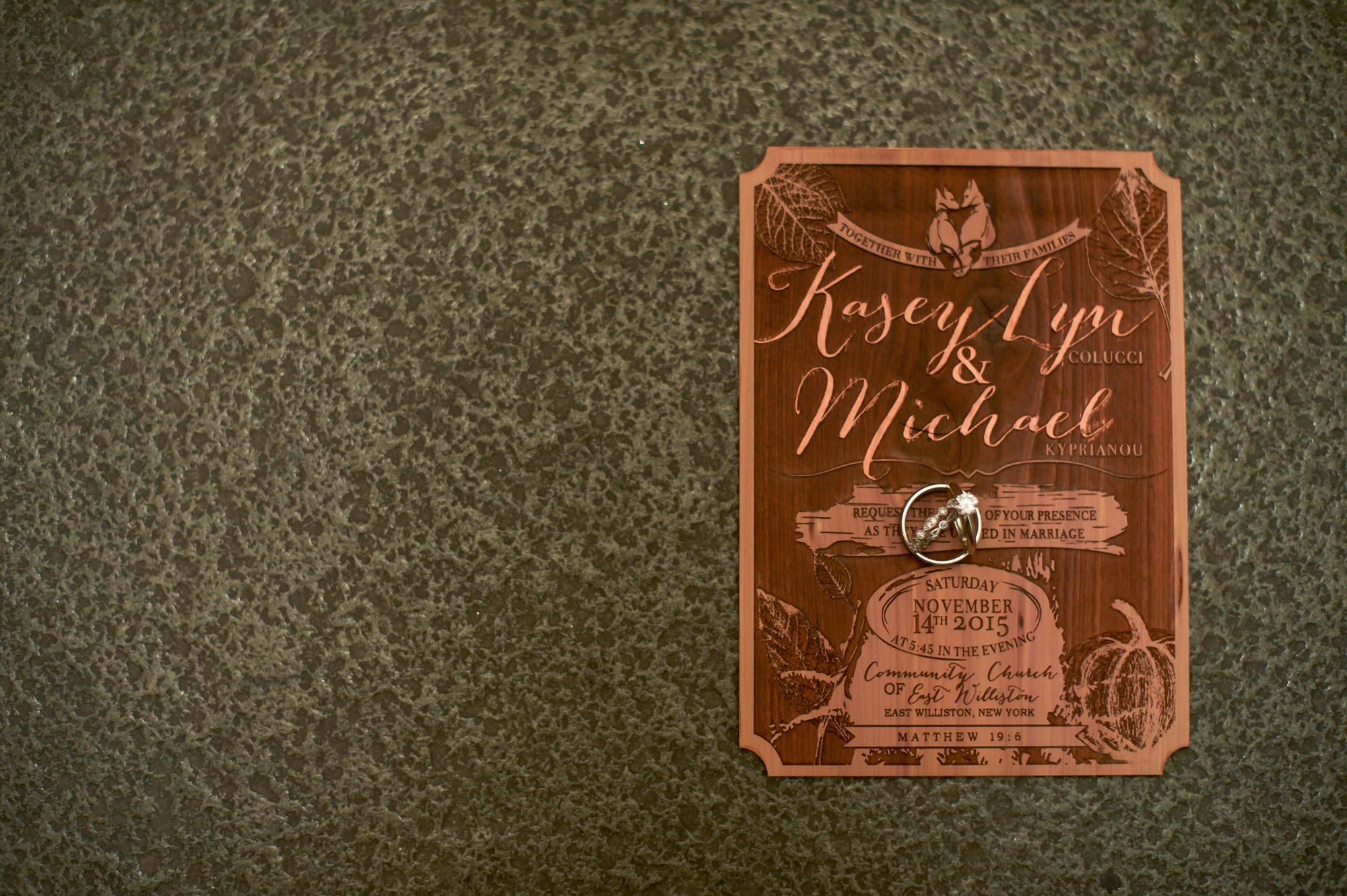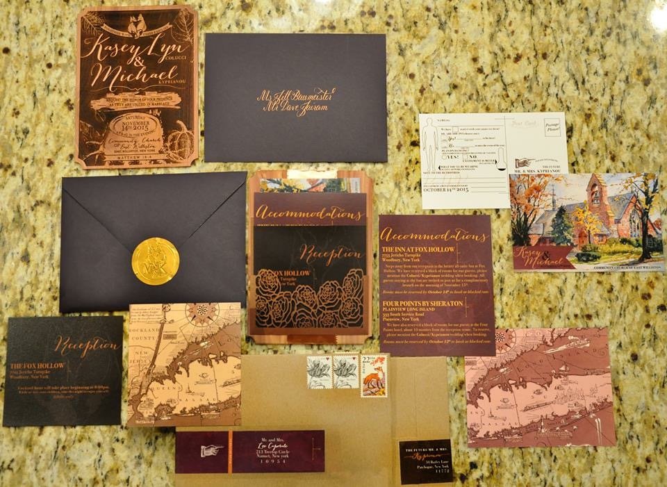 the process came together piece by piece. The maps of long island showing our hometowns and location of events. The plum envelopes to bring my bridesmaid dress color into the theme. Hand embossed foil seals. Stacking my inserts in copper laser cut pockets on the reverse of the wood. The kraft mailers to protect my fragile cedar from the wrath of USPS. The vintage fox stamps from 1987. The copper foil tape to hold the structure together and add more metal to the suite. The RSVPS with watercolor paintings of our church on the front, and fun interactivity on the reverse to keep it lighthearted.
