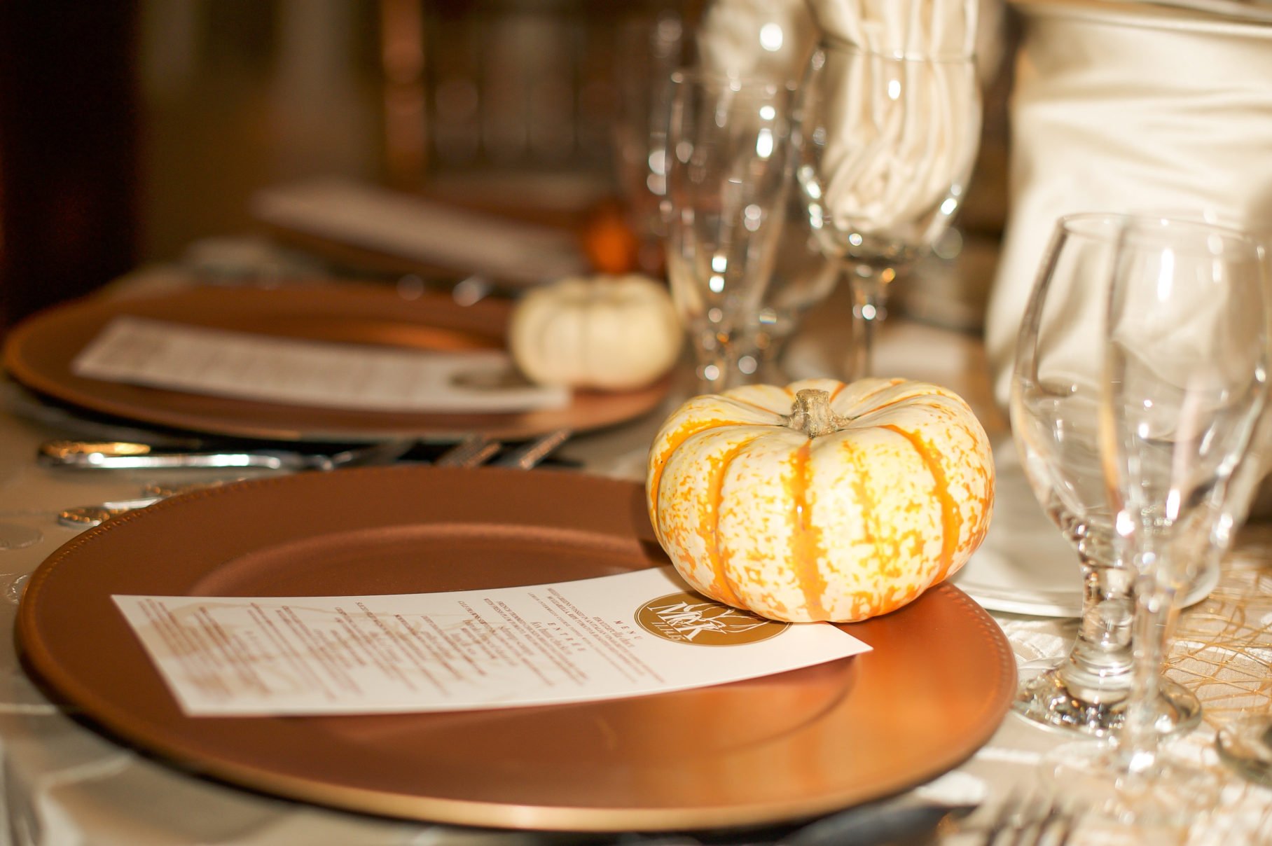 I found some beautiful line work in the pumpkin and leaf skeleton silhouettes. I blew our names up to anchor the design. I clipped the corners to make it a unique shape. Every text element had to be anchored somehow in a nonconventional shape. Bark, branches, stumps, it was all setting the tone for my “raw element” theme. I hand gilded every invite to add a metallic shine to our names. I sketched our foxes in pencil, which would blow up into our wedding logo and be on everything from hotel door hangers to ice scuptures.